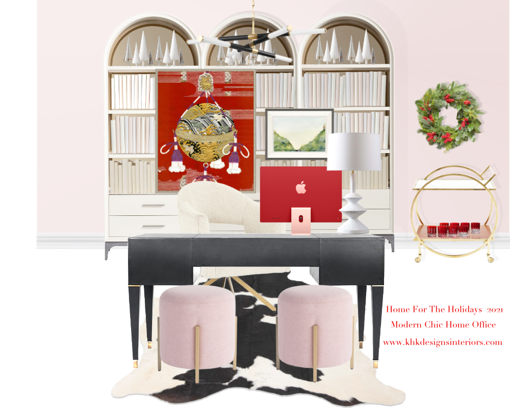 Today, we continue to share our shoppable Home For Holidays Moodboard featuring a modern chic home office. You can click here for Home for Holidays Moodboard Series 2021—Modern Chic Dining Room and click here for Home For Holidays Moodboard Series 2021—Modern Farmhouse Living Room. A home office is where we think, work, be inspired and have a little bit fun time like cocktail parties or high tea moments. So, we would love to have some romantic touches to this holiday home office by introducing blush wall paints, pops of red on the artwork, iMac, wreath and crystal glasses, a bar cart and of course all of the holiday decor accessories that make the room festive.